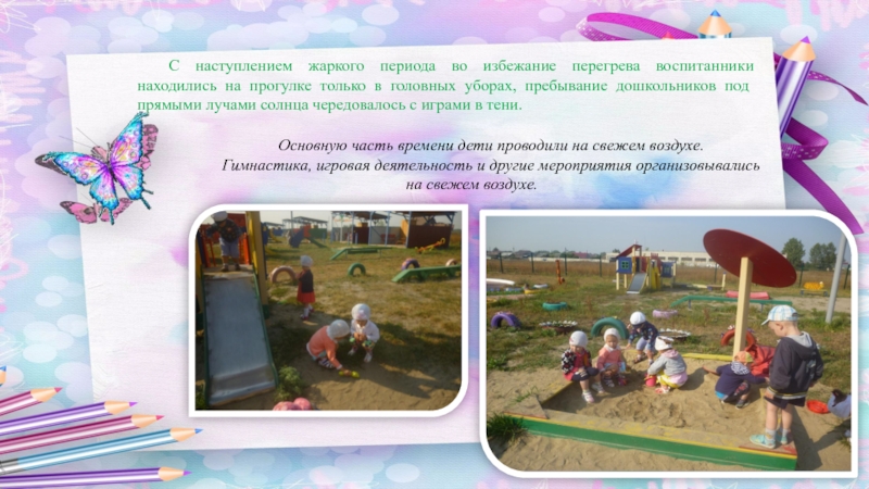 Гимнастика, игровая деятельность и другие мероприятия организовывались на свежем воздухе.