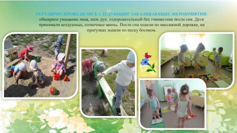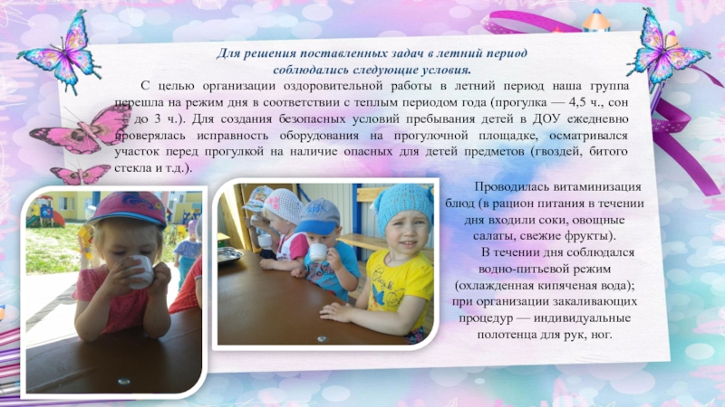 В течении дня соблюдался водно-питьевой режим (охлажденная кипяченая вода); при организации закаливающих процедур — индивидуальные полотенца для рук, ног.