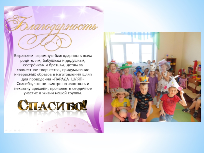 детям за совместное творчество, придумывание интересных образов в изготовлении шляп для проведения «ПАРАДА ШЛЯП»