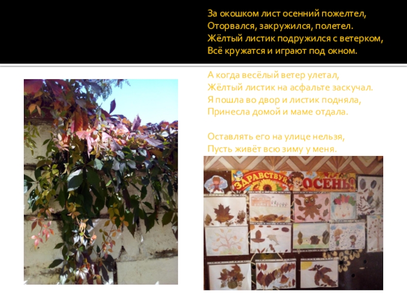 кружатся и играют под окном. А когда весёлый ветер улетал, Жёлтый листик на асфальте заскучал. Я пошла во двор и листик подняла, Принесла домой и маме отдала. Оставлять его на улице нельзя, Пусть живёт всю зиму у меня.