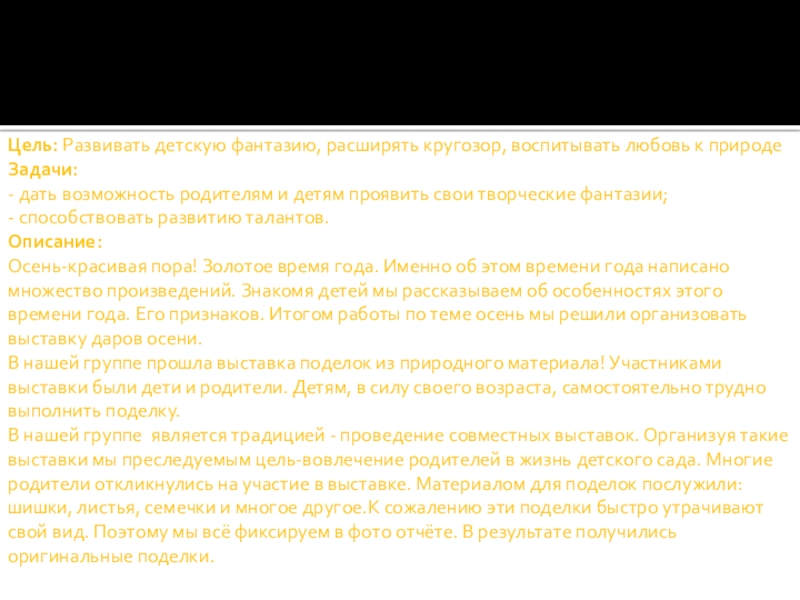 Цель: Развивать детскую фантазию, расширять кругозор, воспитывать любовь к природе Задачи: - дать возможность родителям и детям проявить свои творческие фантазии; - способствовать развитию талантов. Описание: Осень-красивая пора! Золотое время года. Именно об этом времени года написано