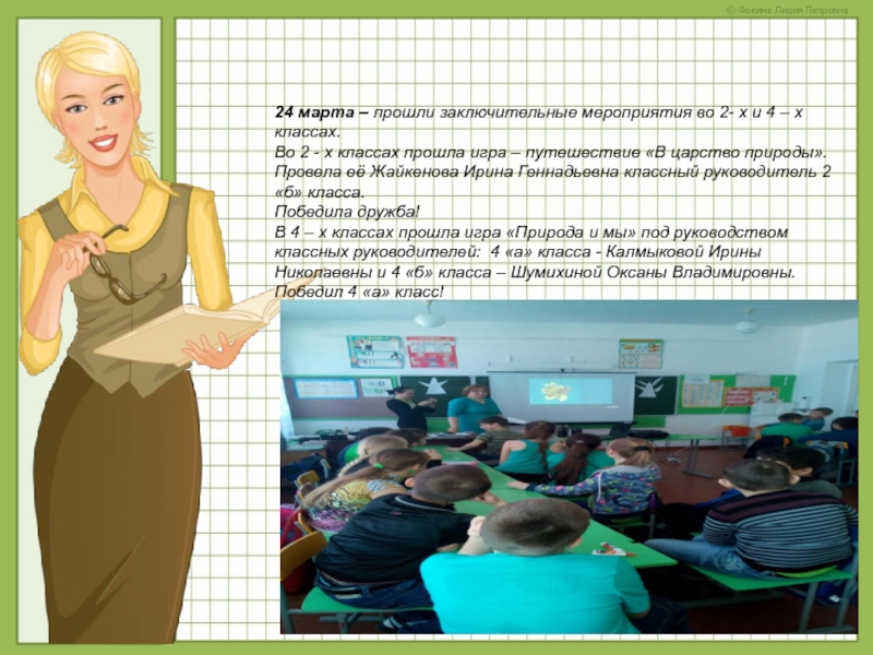 В 4 – х классах прошла игра «Природа и мы» под руководством классных руководителей: 4 «а» класса - Калмыковой Ирины Николаевны и 4 «б» класса – Шумихиной Оксаны Владимировны. Победил 4 «а» класс!