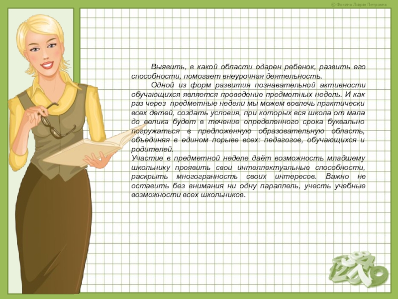Участие в предметной неделе даёт возможность младшему школьнику проявить свои интеллектуальные способности, раскрыть многогранность своих интересов. Важно не оставить без внимания ни одну параллель, учесть учебные возможности всех школьников.