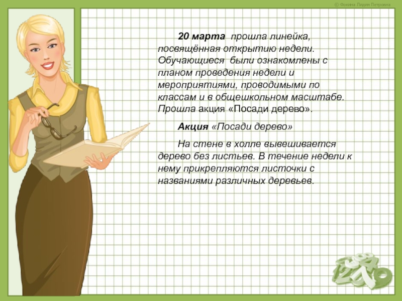 Слайд 820 марта прошла линейка, посвящённая открытию недели. Обучающиеся были ознакомлены с