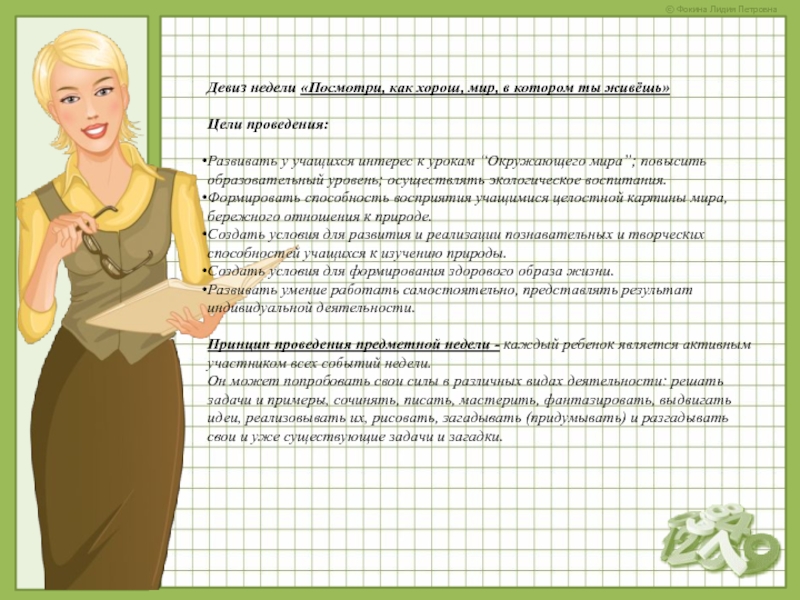 Принцип проведения предметной недели - каждый ребенок является активным участником всех событий недели.