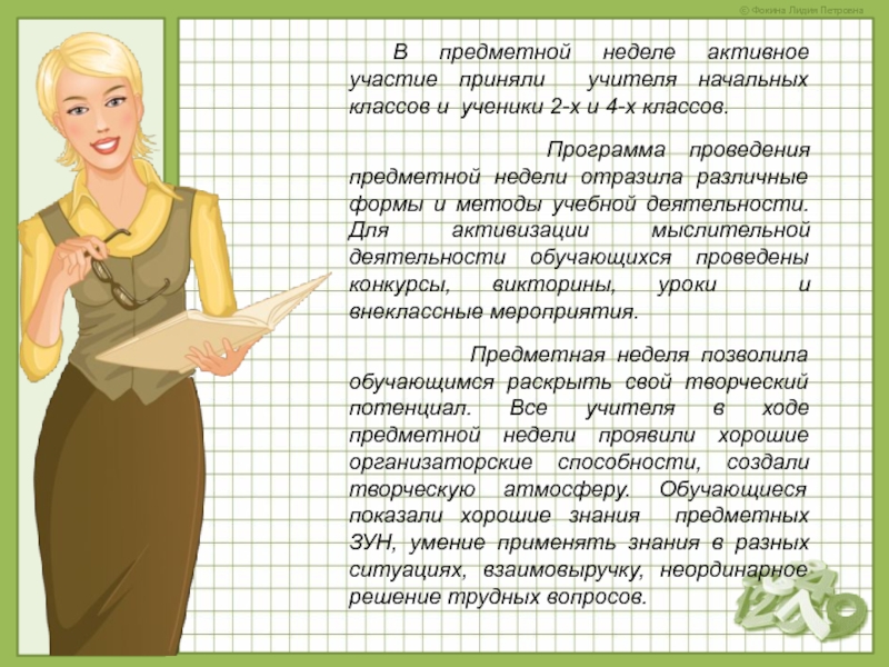 Слайд 7В предметной неделе активное участие приняли учителя начальных классов и ученики