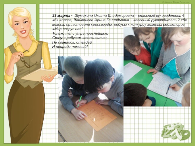 класса, Жайкенова Ирина Геннадьевна – классный руководитель 2 «б» класса, приготовили кроссворды, ребусы к конкурсу главных редакторов «Мир вокруг нас”