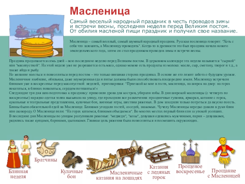 Масленица – самый веселый, самый шумный народный праздник. Русская пословица говорит: "Хоть с себя что заложить, а Масленицу проводить". Когда-то в древности это был праздник начала нового земледельческого года, затем он стал праздником проводов зимы и встречи весны.