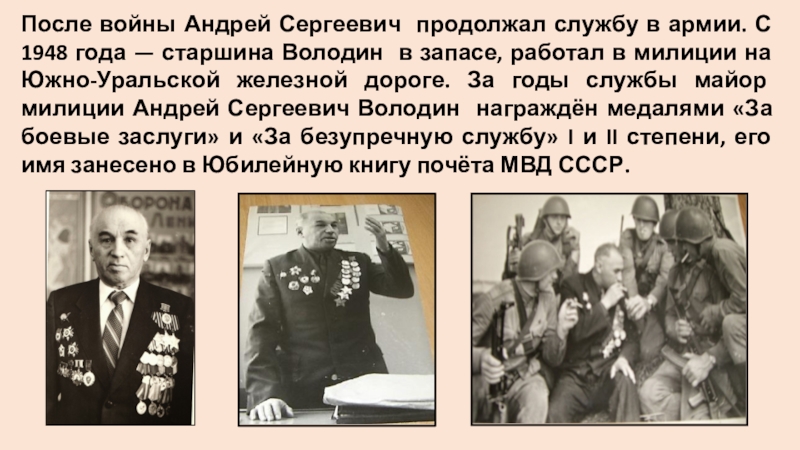 — старшина Володин в запасе, работал в милиции на Южно-Уральской железной дороге. За годы службы майор милиции Андрей Сергеевич Володин награждён медалями «За боевые заслуги» и «За безупречную службу» I и II степени, его имя занесено в Юбилейную книгу почёта МВД СССР.