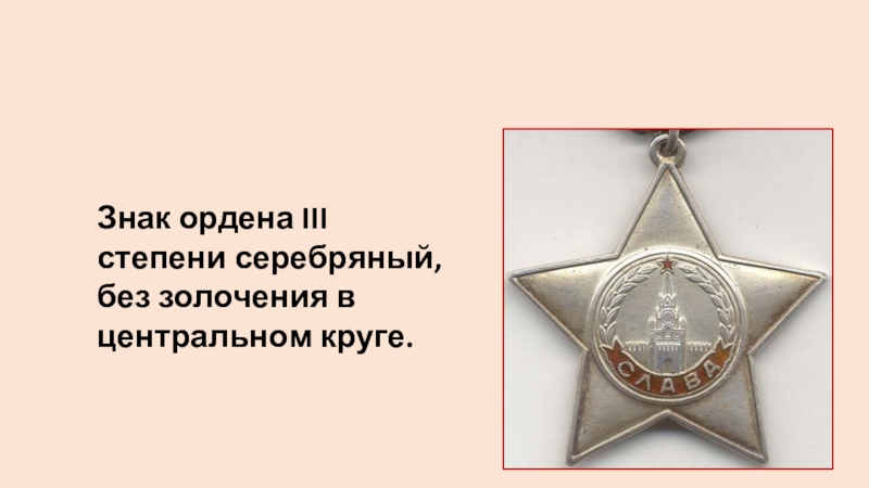 Слайд 14Знак ордена III степени серебряный, без золочения в центральном круге.