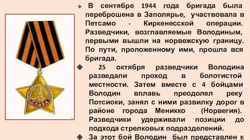 в Петсамо - Киркенесской операции. Разведчики, возглавляемые Володиным, первыми вышли на норвежскую границу. По пути, проложенному ими, прошла вся бригада.