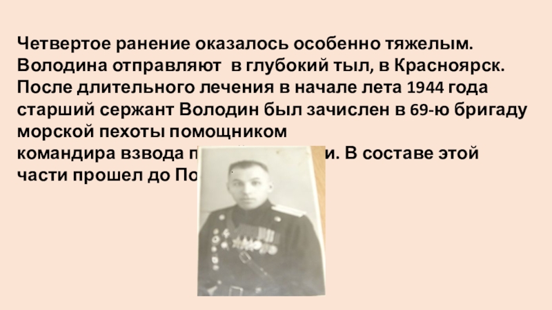 Слайд 19Четвертое ранение оказалось особенно тяжелым. Володина отправляют в глубокий тыл, в