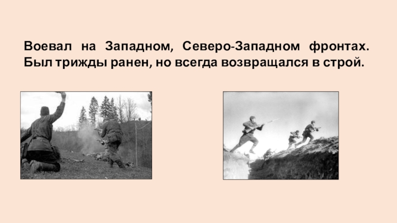 Слайд 18Воевал на Западном, Северо-Западном фронтах. Был трижды ранен, но всегда возвращался