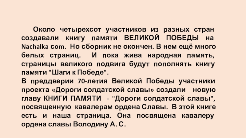 В преддверии 70-летия Великой Победы участники проекта «Дороги солдатской славы» создали новую главу КНИГИ ПАМЯТИ - "Дороги солдатской славы", посвященную кавалерам ордена Славы. В этой книге есть и наша страница. Она посвящена кавалеру ордена славы Володину А. С.
