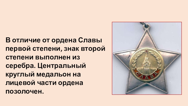 Слайд 13В отличие от ордена Славы первой степени, знак второй степени выполнен
