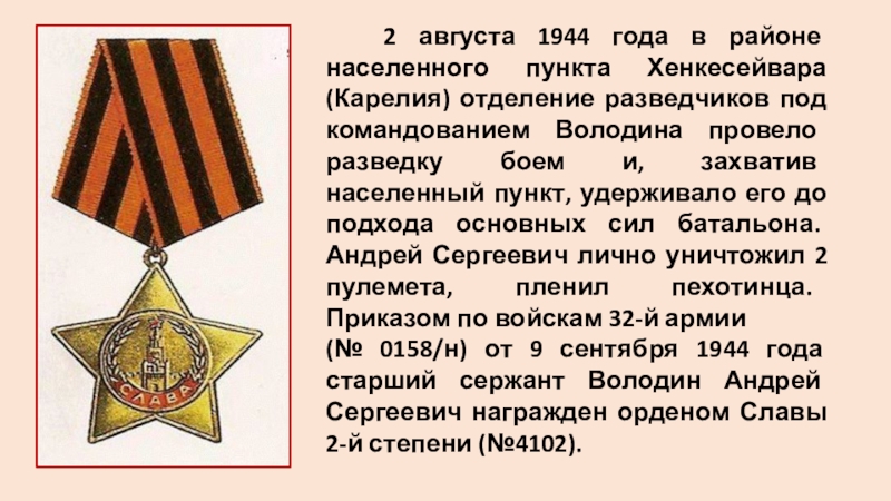 (№ 0158/н) от 9 сентября 1944 года старший сержант Володин Андрей Сергеевич награжден орденом Славы 2-й степени (№4102).