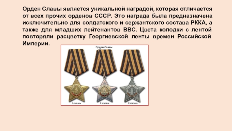 Слайд 10Орден Славы является уникальной наградой, которая отличается от всех прочих орденов