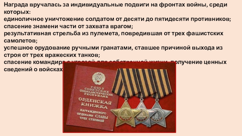 Слайд 11Награда вручалась за индивидуальные подвиги на фронтах войны, среди которых: