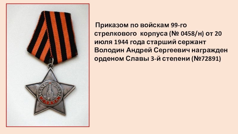 1944 года старший сержант Володин Андрей Сергеевич награжден орденом Славы 3-й степени (№72891)