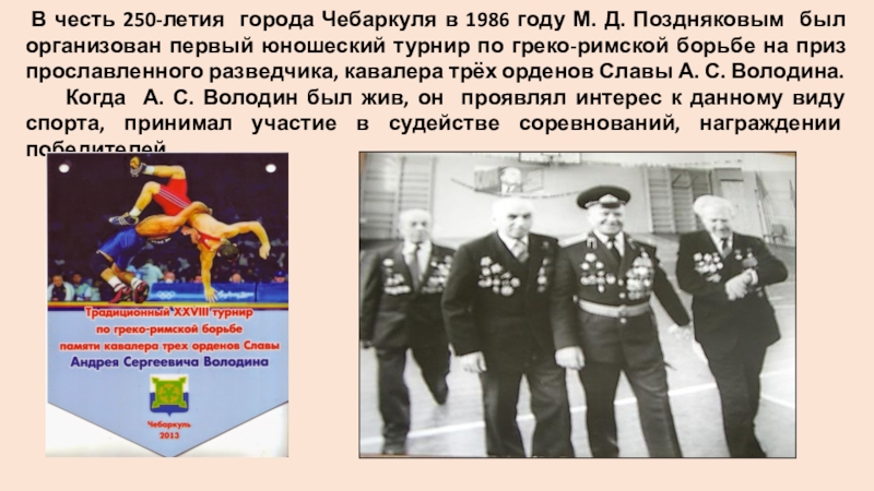 Слайд 25 В честь 250-летия города Чебаркуля в 1986 году М. Д.