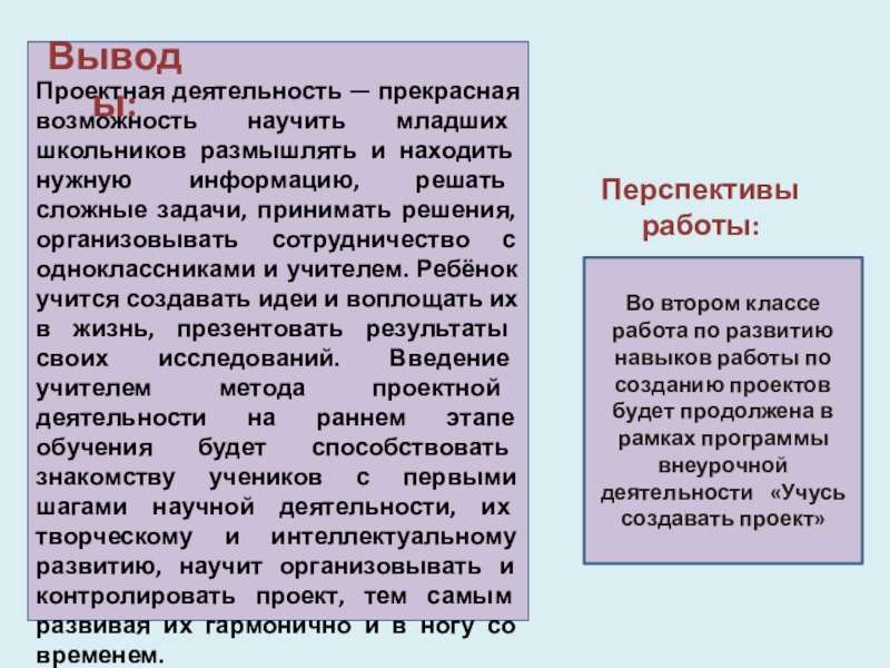 Во втором классе работа по развитию навыков работы по созданию проектов будет продолжена в рамках программы внеурочной