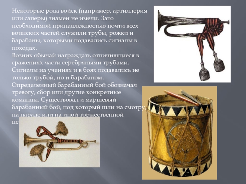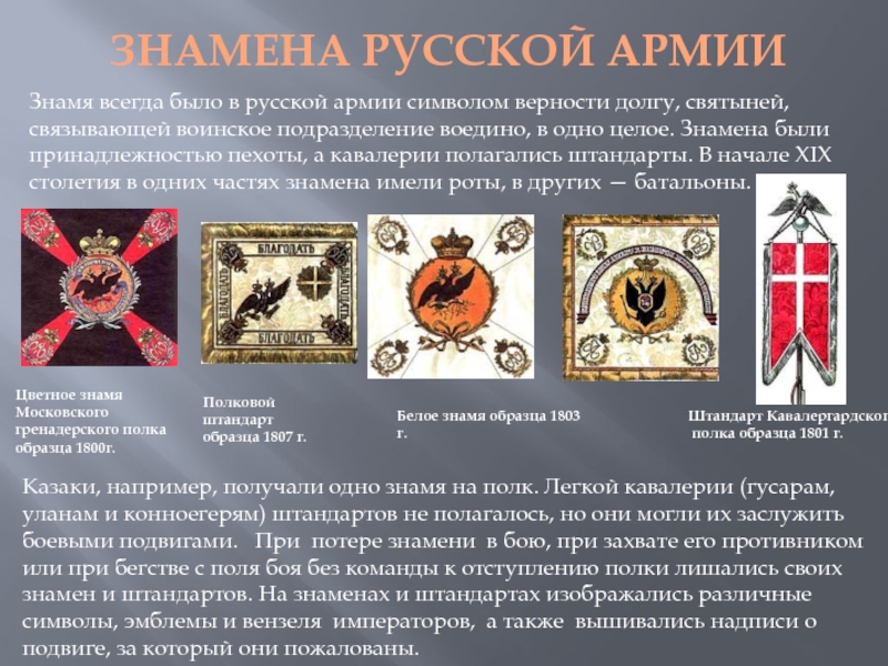 Казаки, например, получали одно знамя на полк. Легкой кавалерии (гусарам, уланам и конноегерям) штандартов не полагалось, но они могли их заслужить боевыми подвигами. При потере знамени в бою, при захвате его противником или при бегстве с поля боя без команды к отступлению полки лишались своих знамен и штандартов. На знаменах и штандартах изображались различные символы, эмблемы и вензеля императоров, а также вышивались надписи о подвиге, за который они пожалованы.