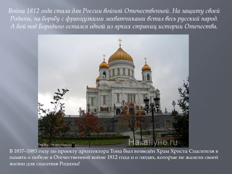 В 1837–1883 году по проекту архитектора Тона был возведён Храм Христа Спасителя в память о победе в Отечественной войне 1812 года и о людях, которые не жалели своей жизни для спасения Родины!