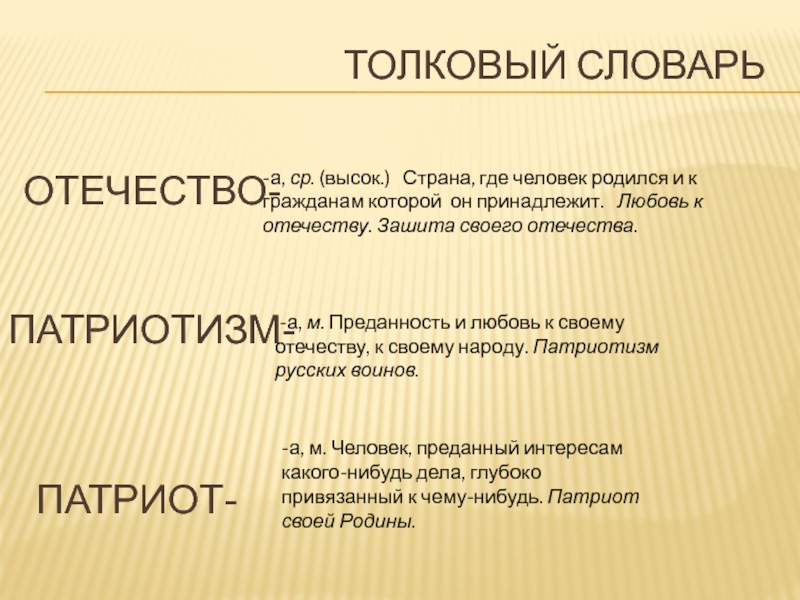 -а, м. Преданность и любовь к своему отечеству, к своему народу. Патриотизм русских воинов.