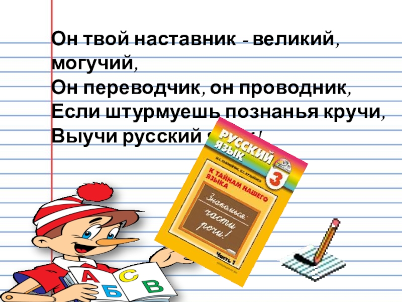 Он твой наставник - великий, могучий, Он переводчик, он проводник, Если штурмуешь познанья кручи, Выучи русский язык!