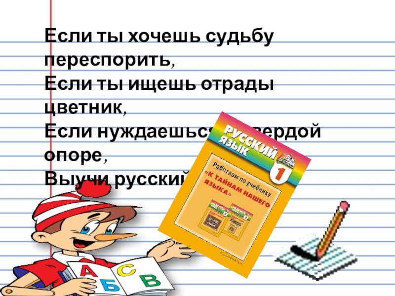 Если ты хочешь судьбу переспорить, Если ты ищешь отрады цветник, Если нуждаешься в твердой опоре, Выучи русский