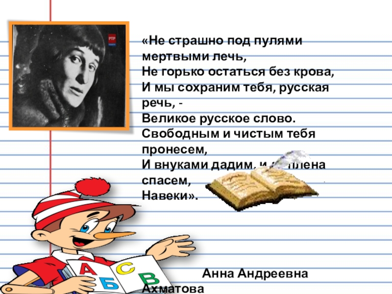 И мы сохраним тебя, русская речь, - Великое русское слово. Свободным и чистым тебя пронесем, И внуками дадим, и от плена спасем, Навеки».