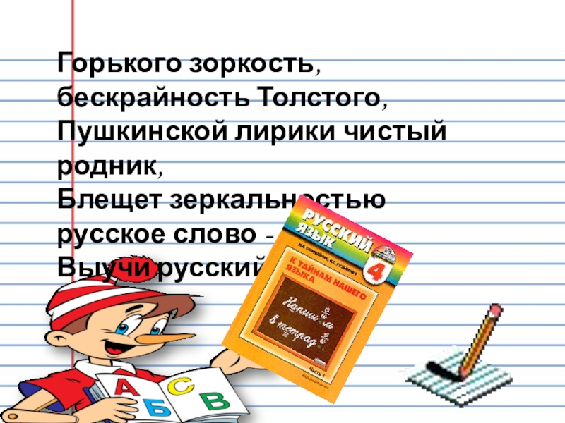 Горького зоркость, бескрайность Толстого, Пушкинской лирики чистый родник, Блещет зеркальностью русское слово - Выучи русский язык!