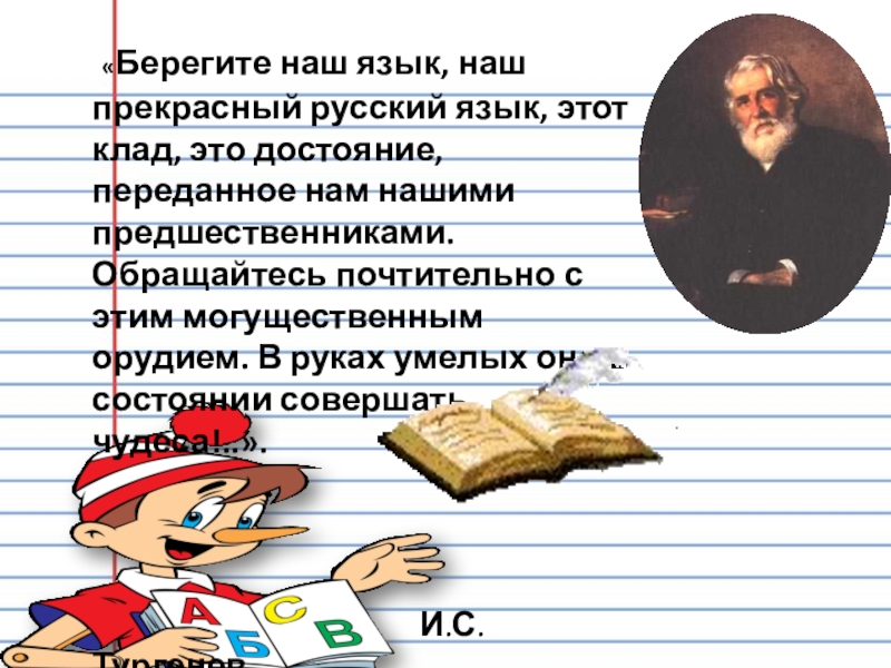 Слайд 4 «Берегите наш язык, наш прекрасный русский язык, этот клад, это достояние,