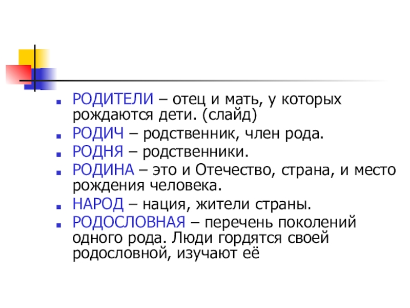 РОДИТЕЛИ – отец и мать, у которых рождаются дети. (слайд)