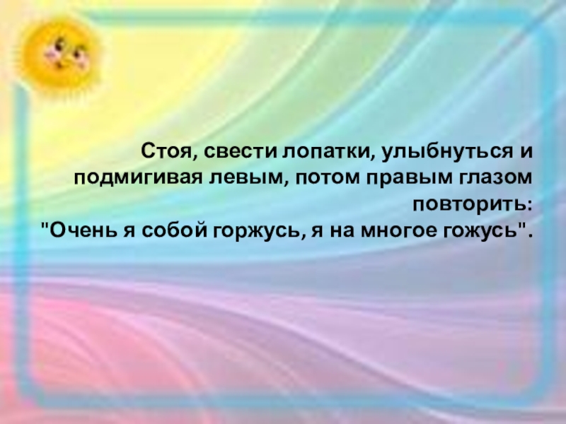 Слайд 19Стоя, свести лопатки, улыбнуться и подмигивая левым, потом правым глазом повторить: