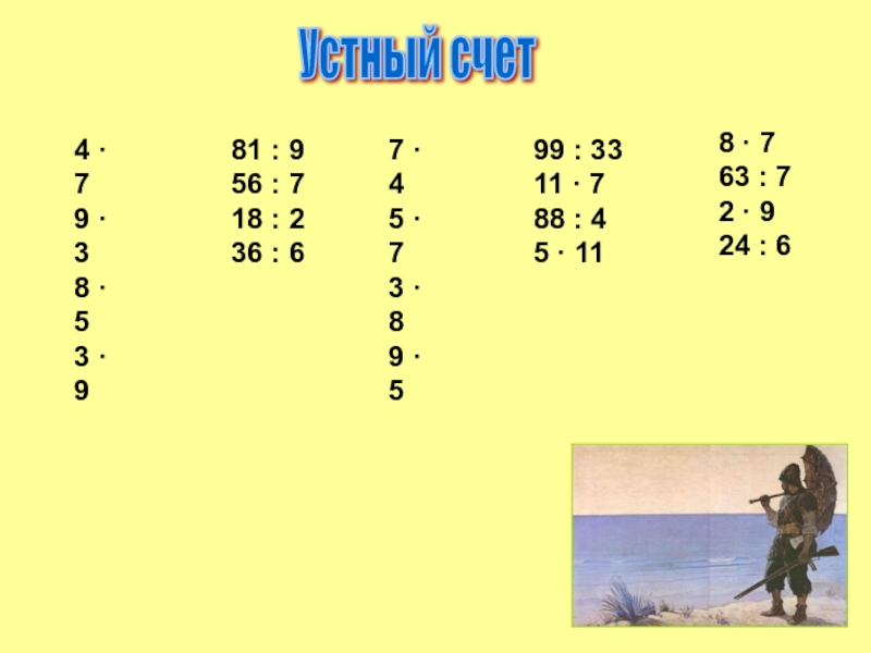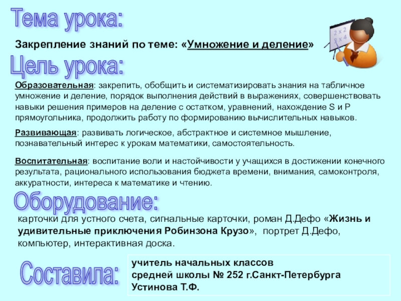 карточки для устного счета, сигнальные карточки, роман Д.Дефо «Жизнь и удивительные приключения Робинзона Крузо», портрет Д.Дефо, компьютер, интерактивная доска.