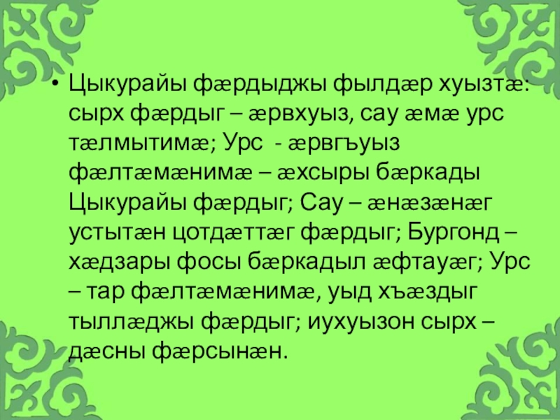 Слайд 8Цыкурайы фæрдыджы фылдæр хуызтæ: сырх фæрдыг – æрвхуыз, сау æмæ урс