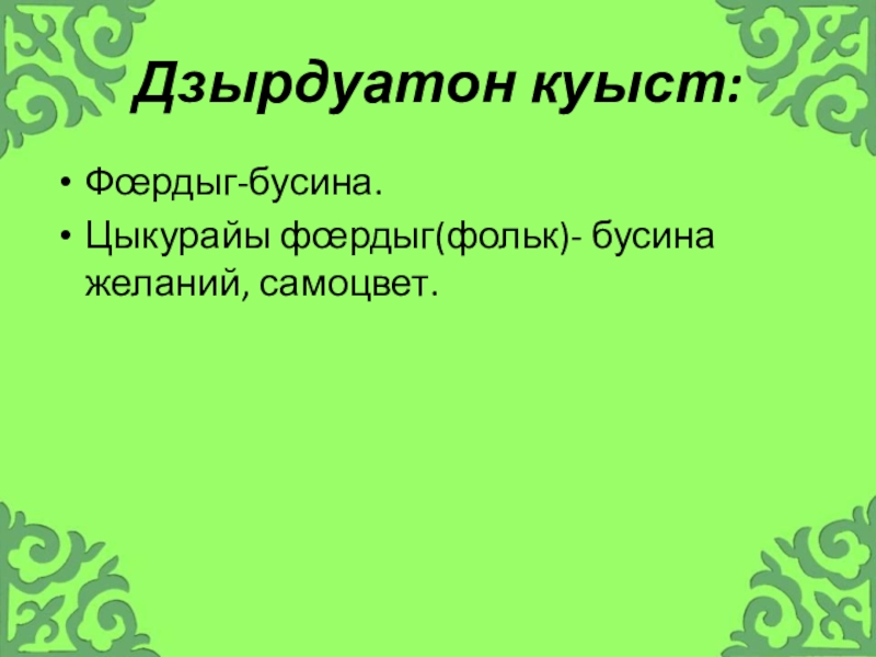 Цыкурайы фœрдыг(фольк)- бусина желаний, самоцвет.