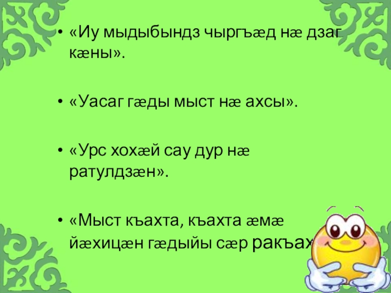 Слайд 12«Иу мыдыбындз чыргъæд нæ дзаг кæны».