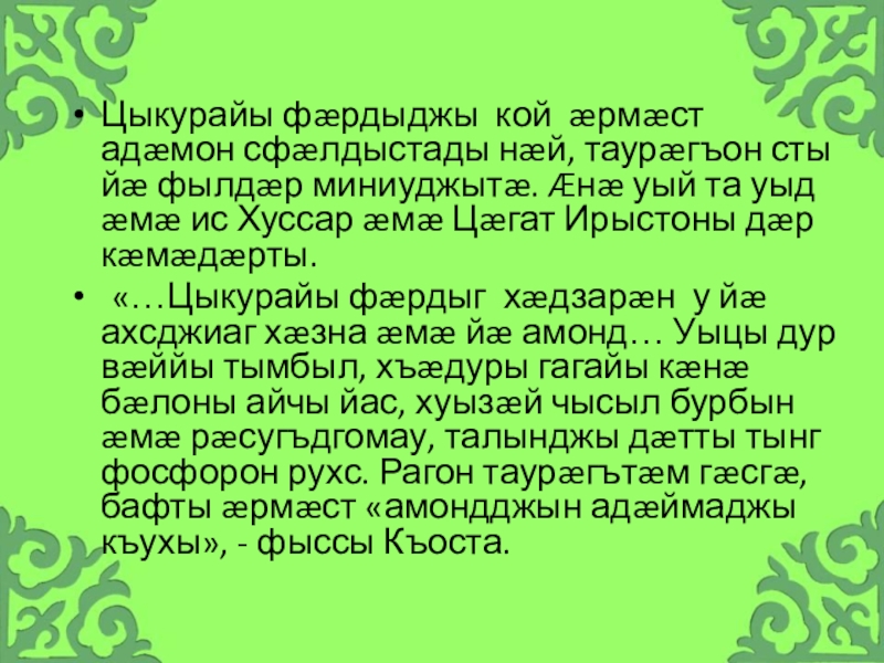 Слайд 7Цыкурайы фæрдыджы кой æрмæст адæмон сфæлдыстады нæй, таурæгъон сты йæ фылдæр
