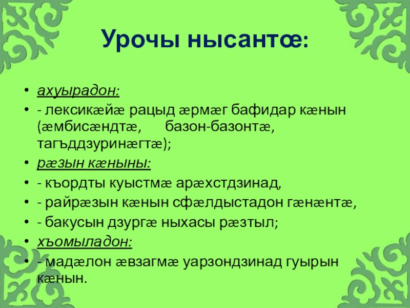- лексикæйæ рацыд æрмæг бафидар кæнын (æмбисæндтæ, базон-базонтæ, тагъддзуринæгтæ);