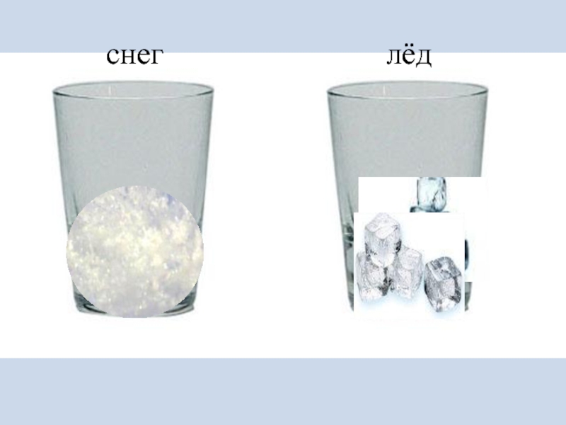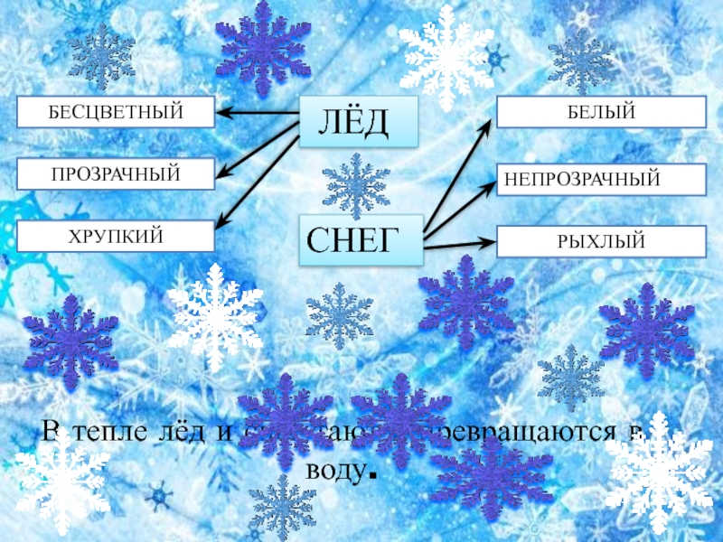 БЕЛЫЙНЕПРОЗРАЧНЫЙРЫХЛЫЙБЕСЦВЕТНЫЙ ЛЁДПРОЗРАЧНЫЙХРУПКИЙСНЕГВ тепле лёд и снег тают и превращаются в воду.
