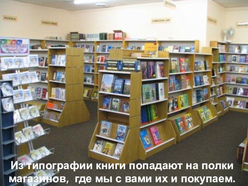 Слайд 13Из типографии книги попадают на полки магазинов,  где мы с вами