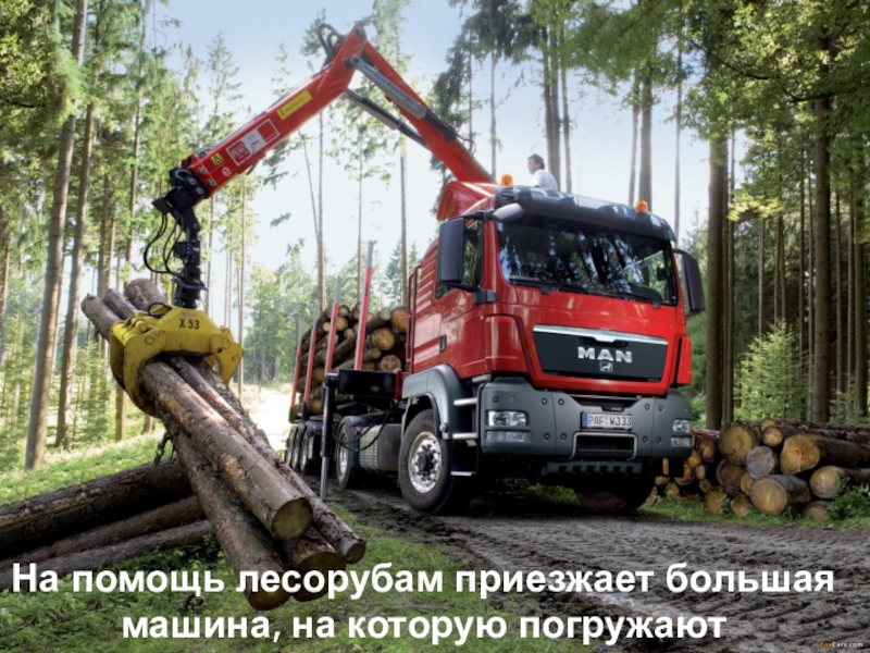 На помощь лесорубам приезжает большая машина, на которую погружают срубленный лес.