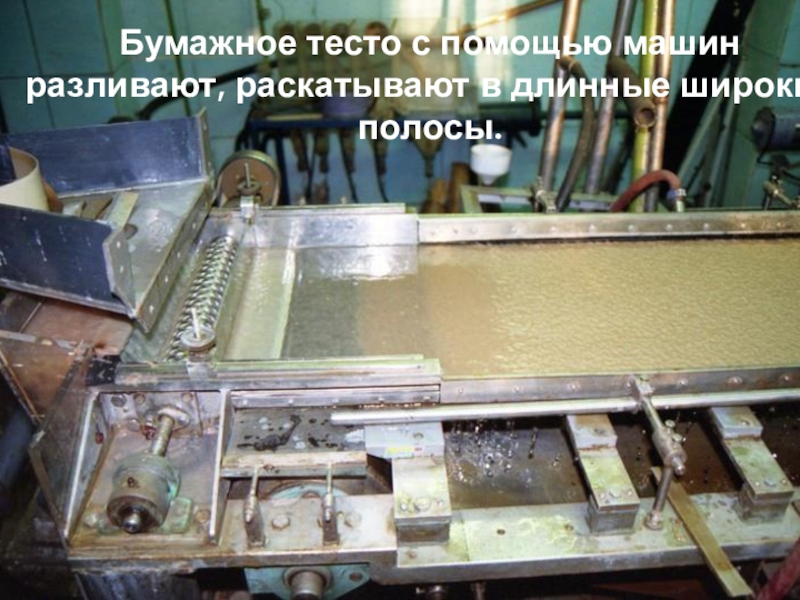 Слайд 10Бумажное тесто с помощью машин разливают, раскатывают в длинные широкие полосы.