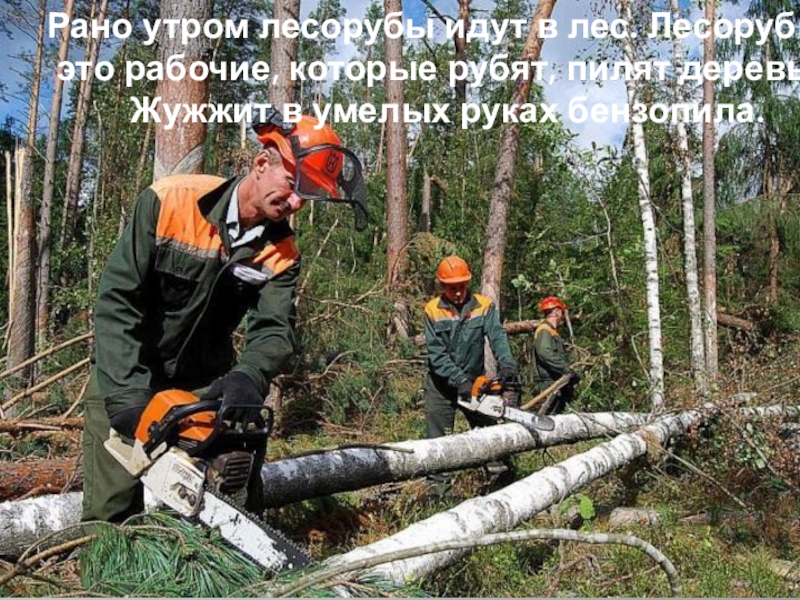 Слайд 3Рано утром лесорубы идут в лес. Лесорубы - это рабочие, которые