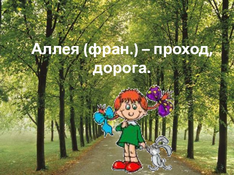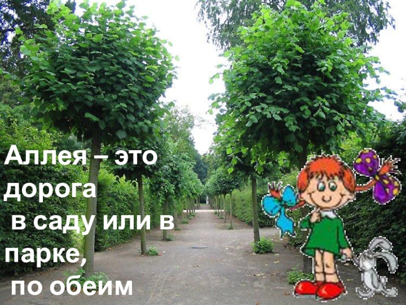 Аллея – это дорога в саду или в парке, по обеим сторонамкоторой посажены деревья или кусты.