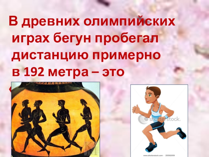В древних олимпийских играх бегун пробегал дистанцию примерно в 192 метра – это «стадий».
