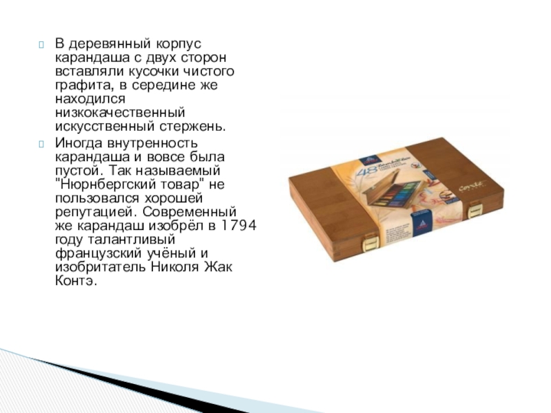 Слайд 6В деревянный корпус карандаша с двух сторон вставляли кусочки чистого графита,