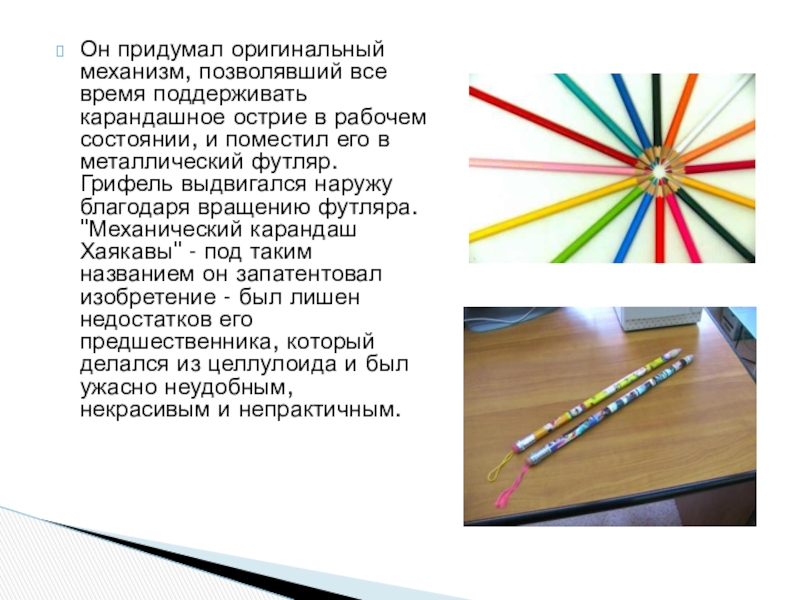 Слайд 12Он придумал оригинальный механизм, позволявший все время поддерживать карандашное острие в